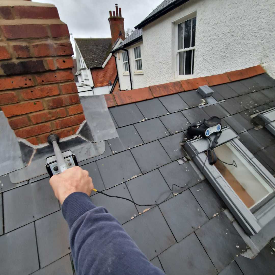 Our Roof leak detection surveyors identify and locate leaks on flat, pitched and commercial roofs can involve the use of drones, tracer gases, smoke testing, damp meters or electronic leak testing equipment.